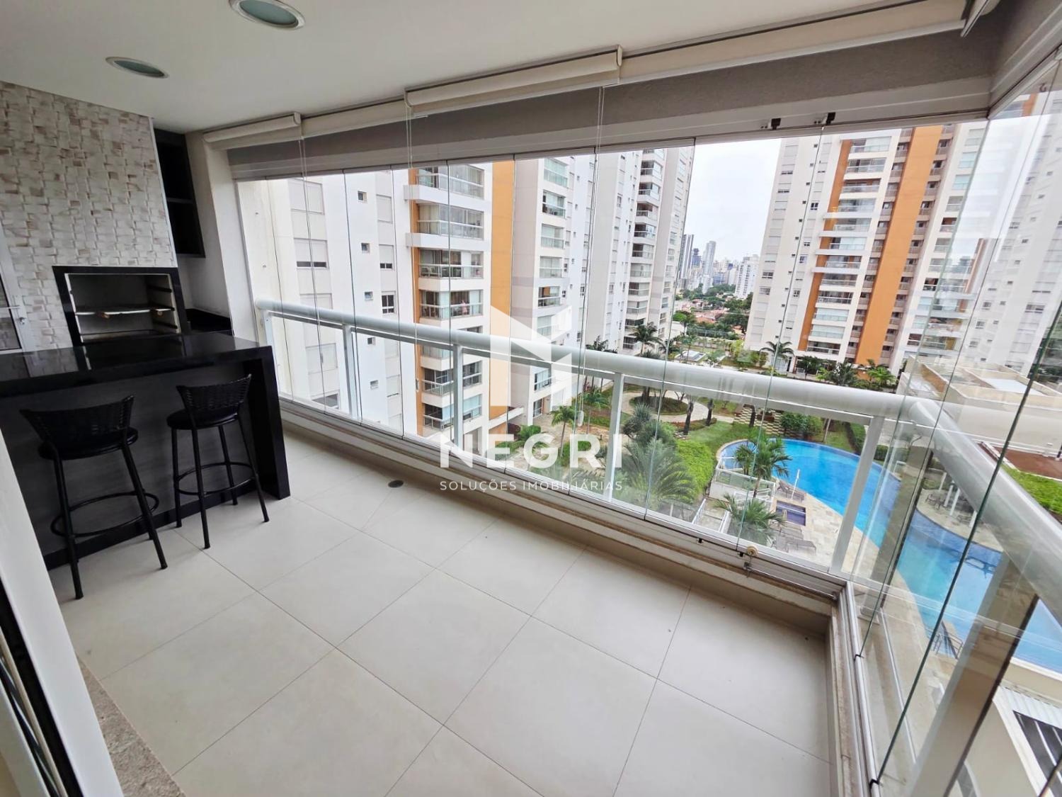 O imóvel de 119m² possui 3 suítes equipadas com armários planejados e ar-condicionado, sala de TV, escritório, cozinha aberta equipada com armários planejados, fogão, forno e coifa, varanda gourmet, uma despensa, armário de serviço e área de serviço com varanda técnica.