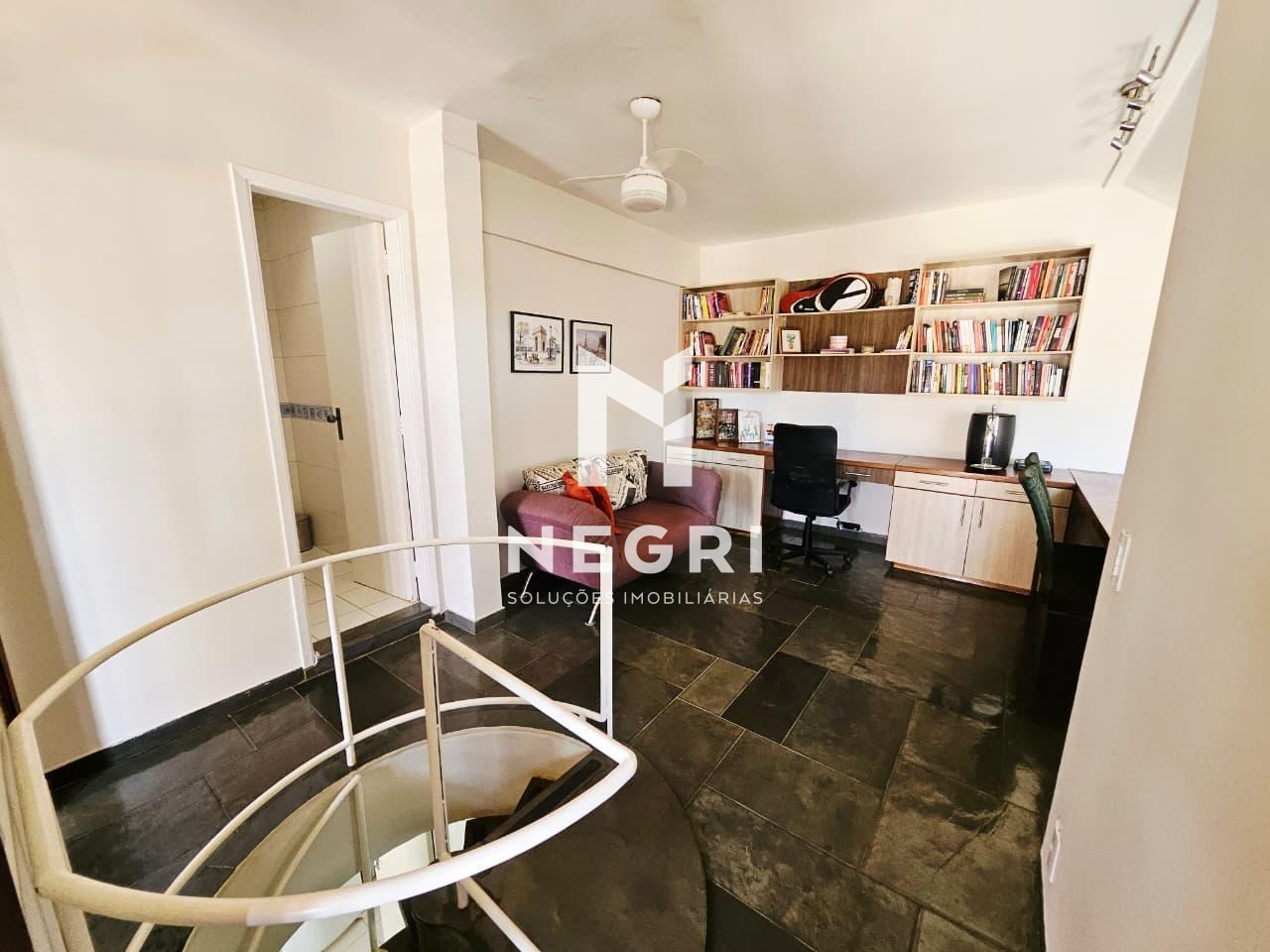 Sala ampla com banheiro de apoio, ideal para home office, espaço gourmet ou sala de TV;