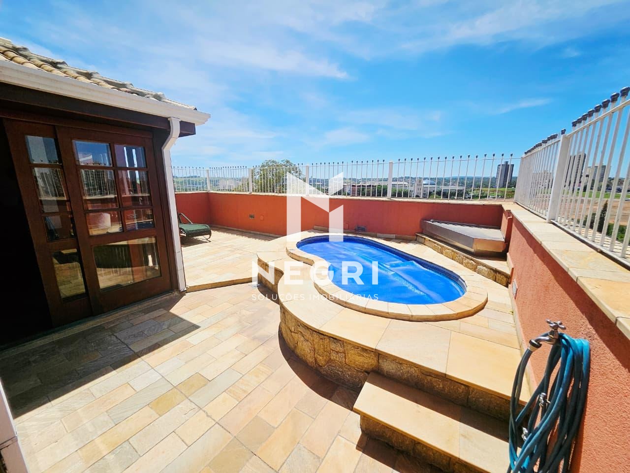 Área externa com churrasqueira, solário e piscina privativa, perfeita para relaxar e receber convidados com total privacidade.