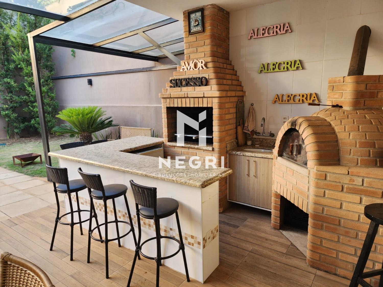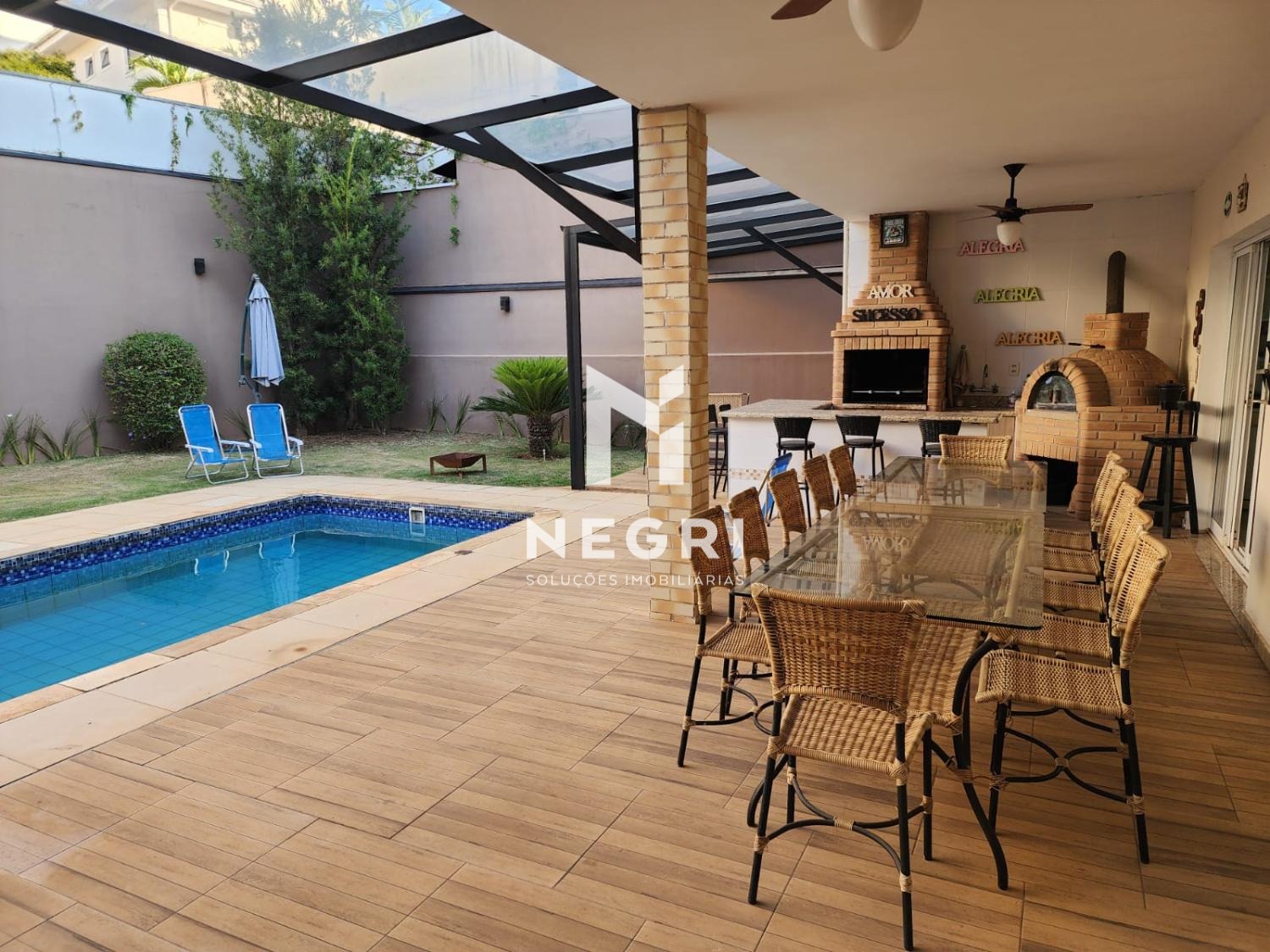 Área gourmet completa: churrasqueira, forno de pizza e piscina