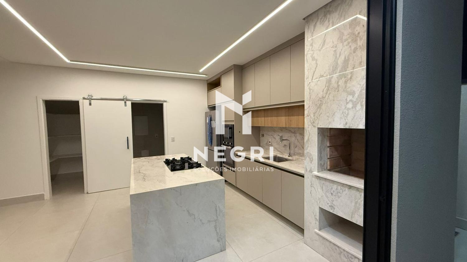 Área gourmet coberta com churrasqueira moderna.