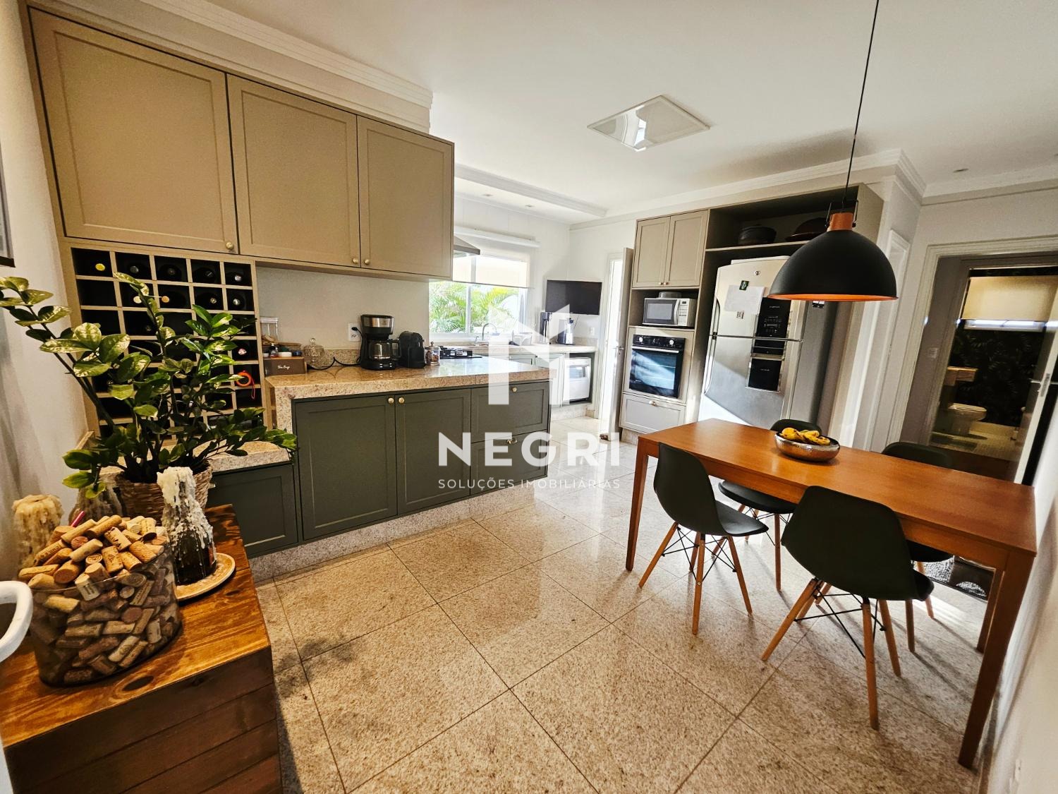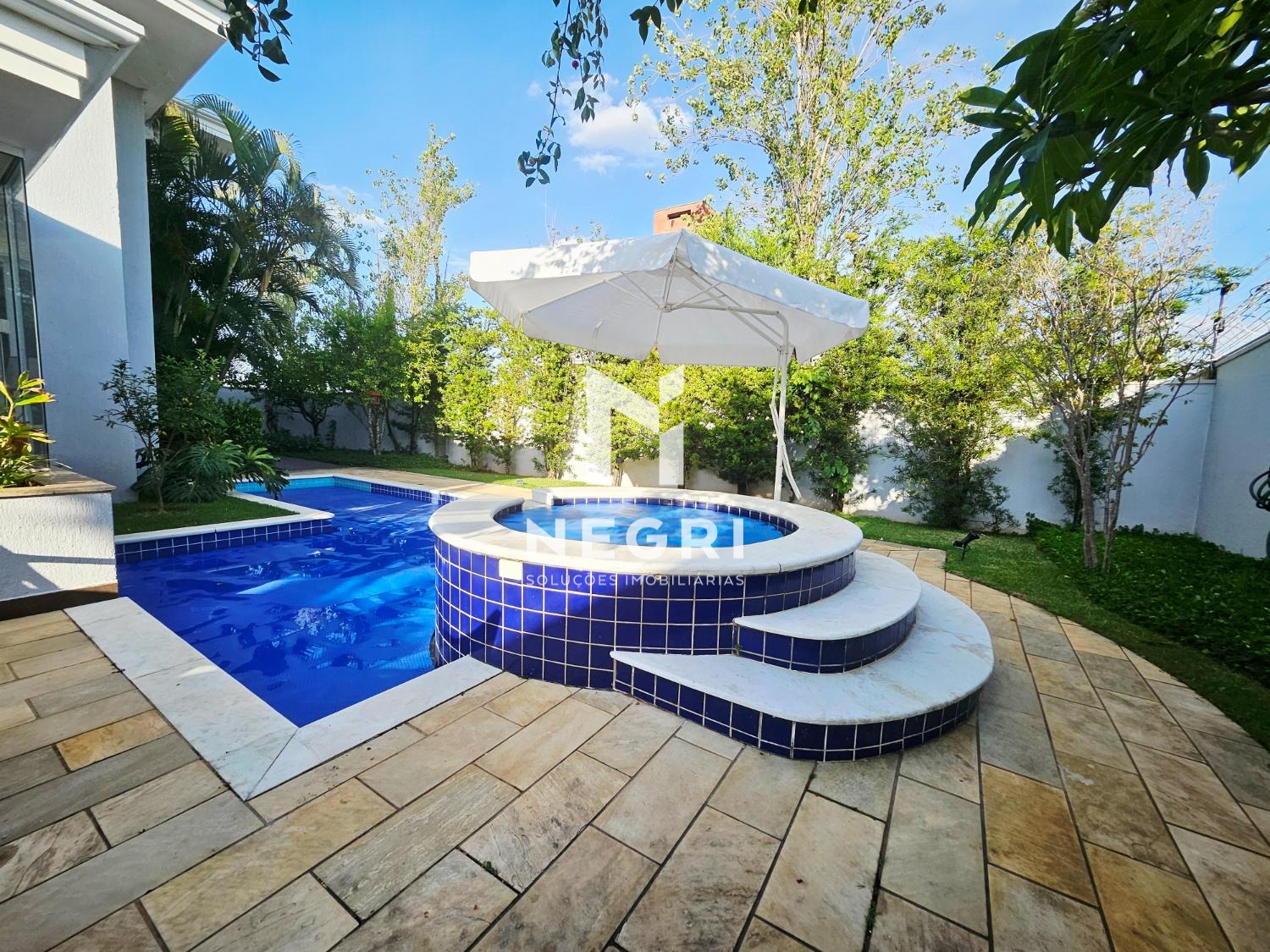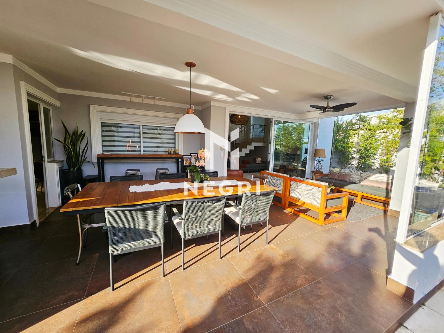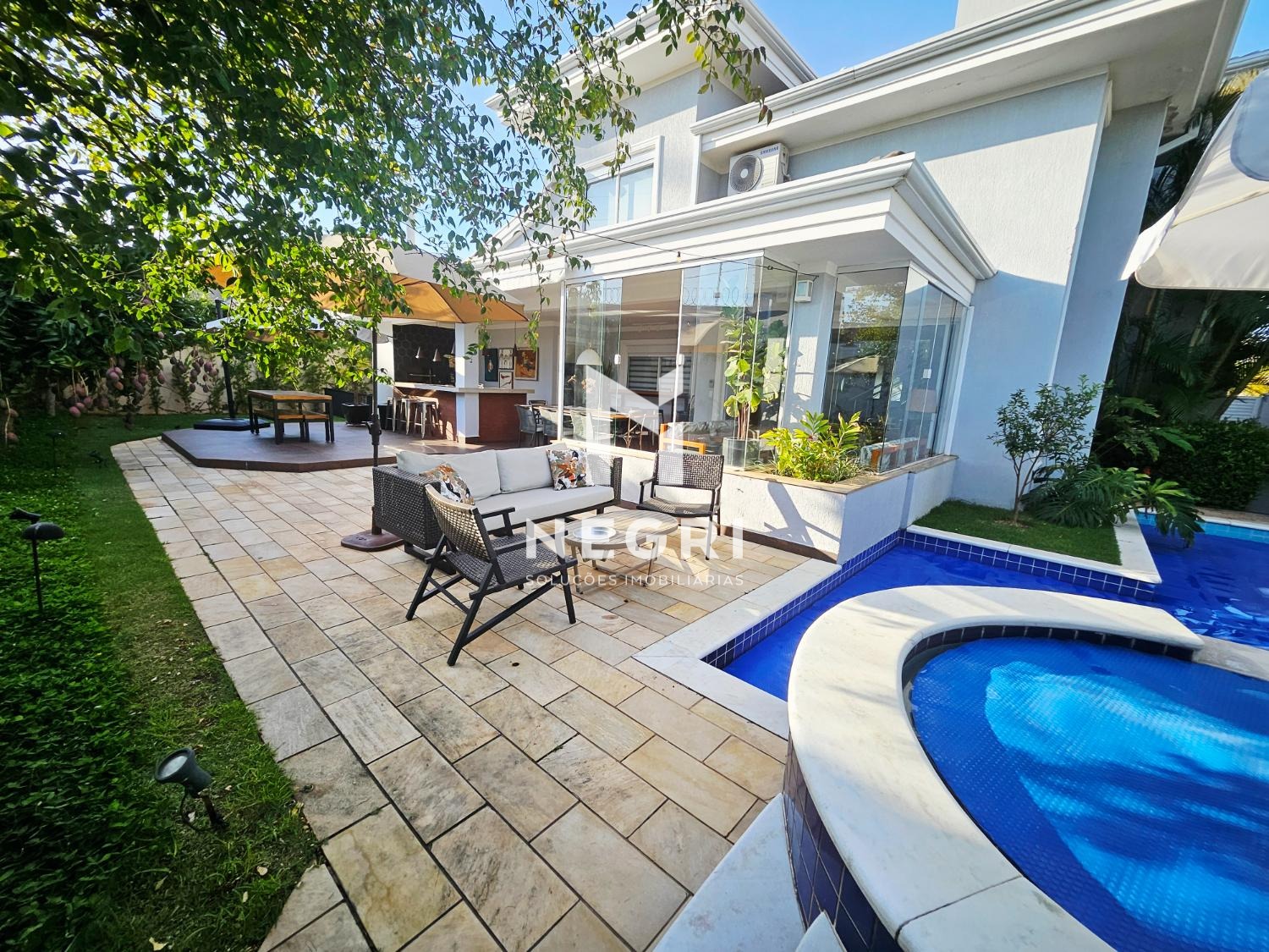 a área de lazer é um verdadeiro convite para receber e desfrutar: amplo espaço gourmet integrado, piscina grande e aquecida, com hidro independente, cercada por diversas árvores frutíferas e muito verde, proporcionando a sensação de férias permanentes em casa.