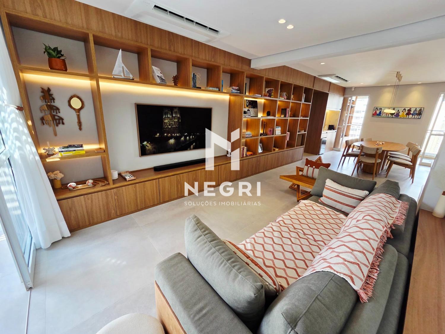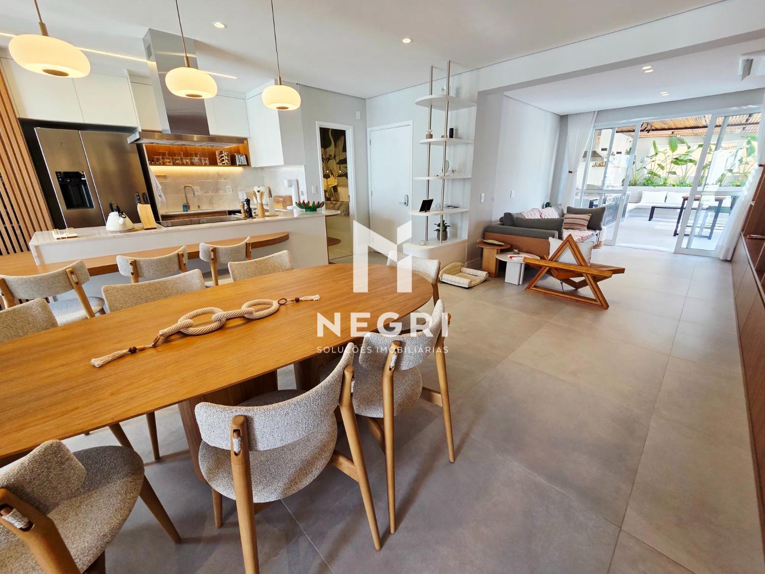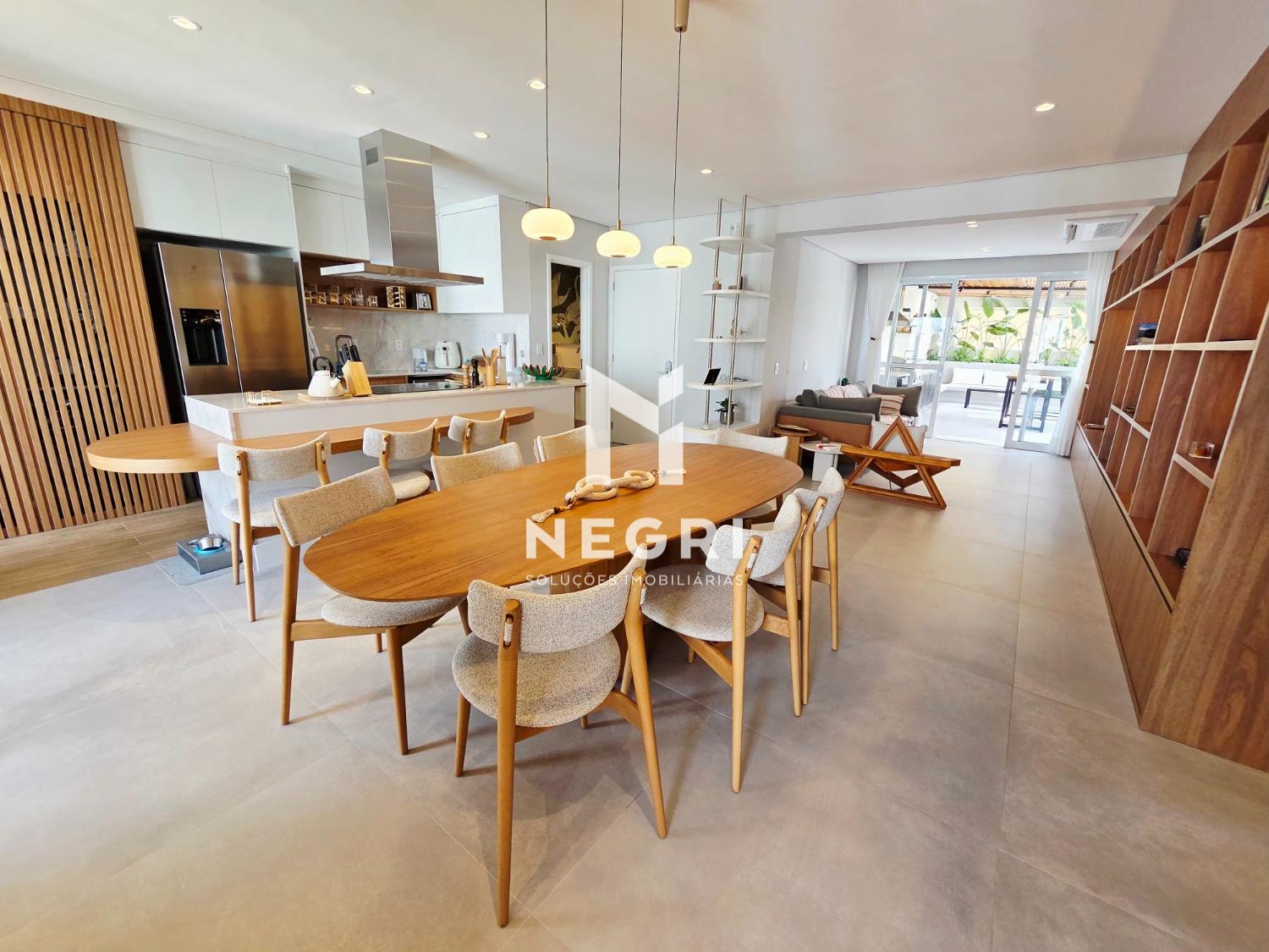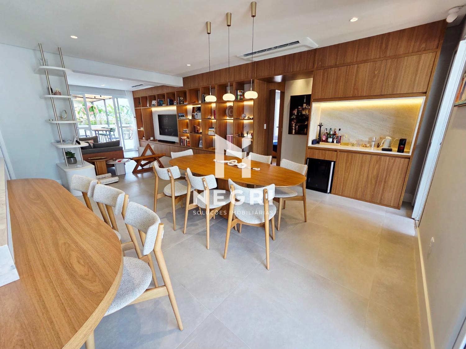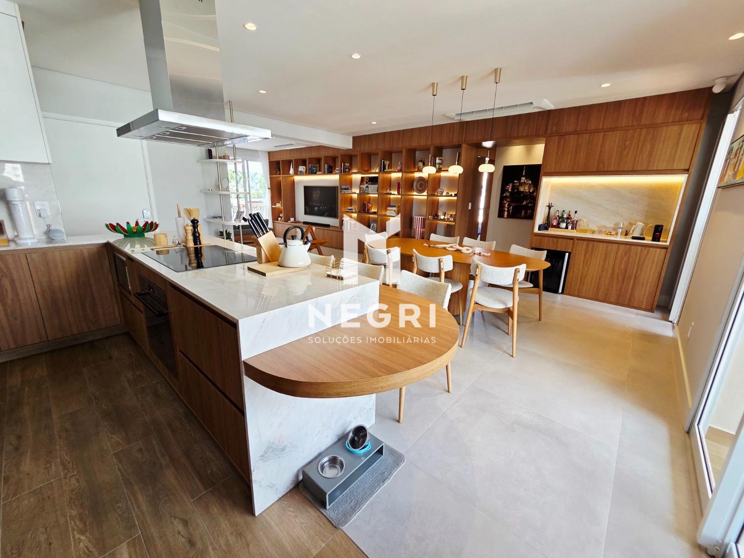 A sala de jantar se integra perfeitamente à cozinha gourmet e à sala de TV, criando um ambiente contínuo, elegante e extremamente convidativo — com mobiliário refinado e acabamentos de altíssimo padrão.
