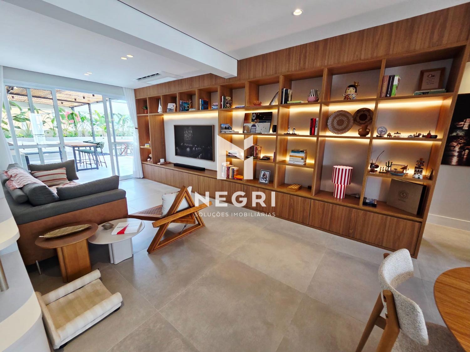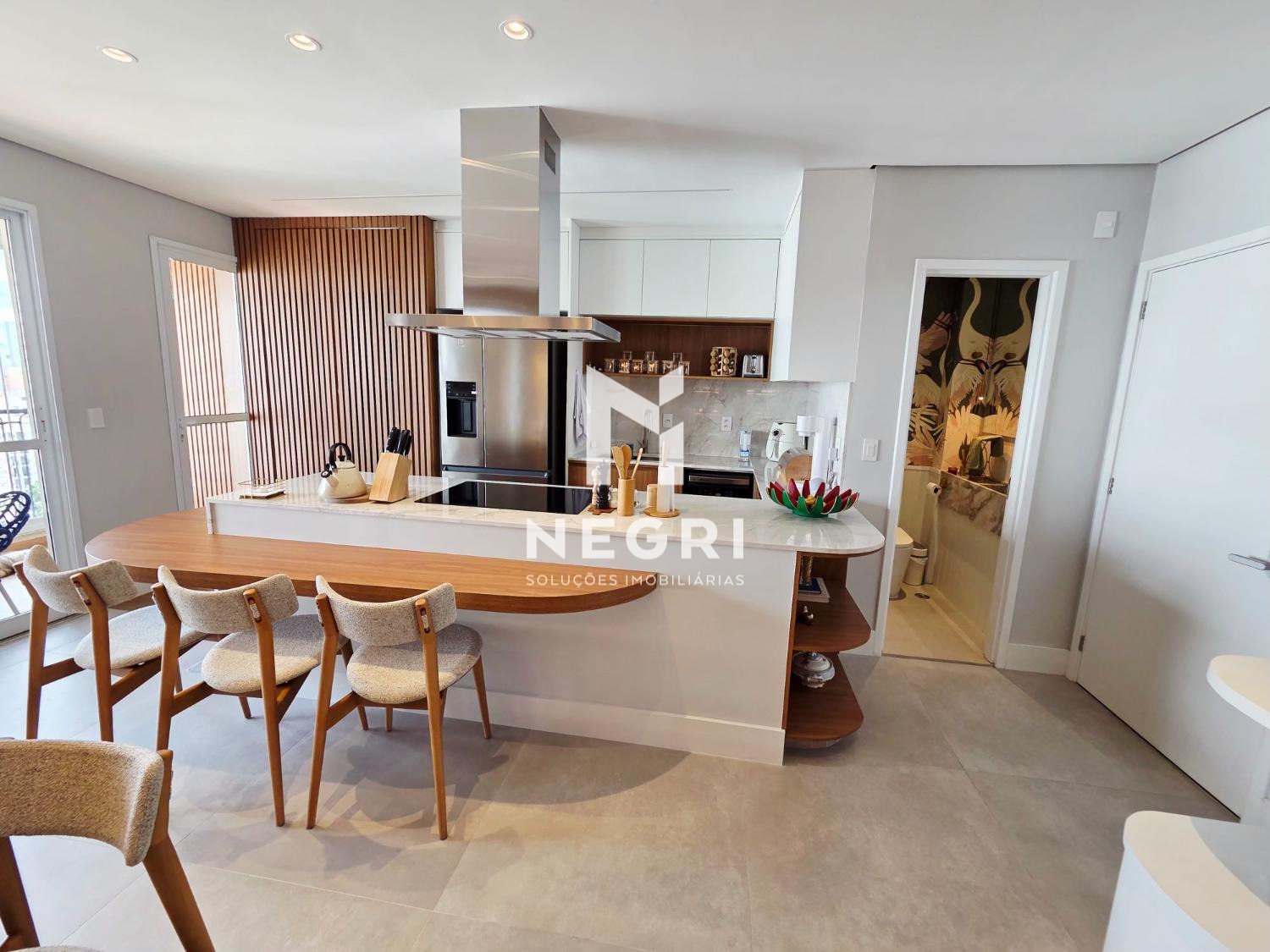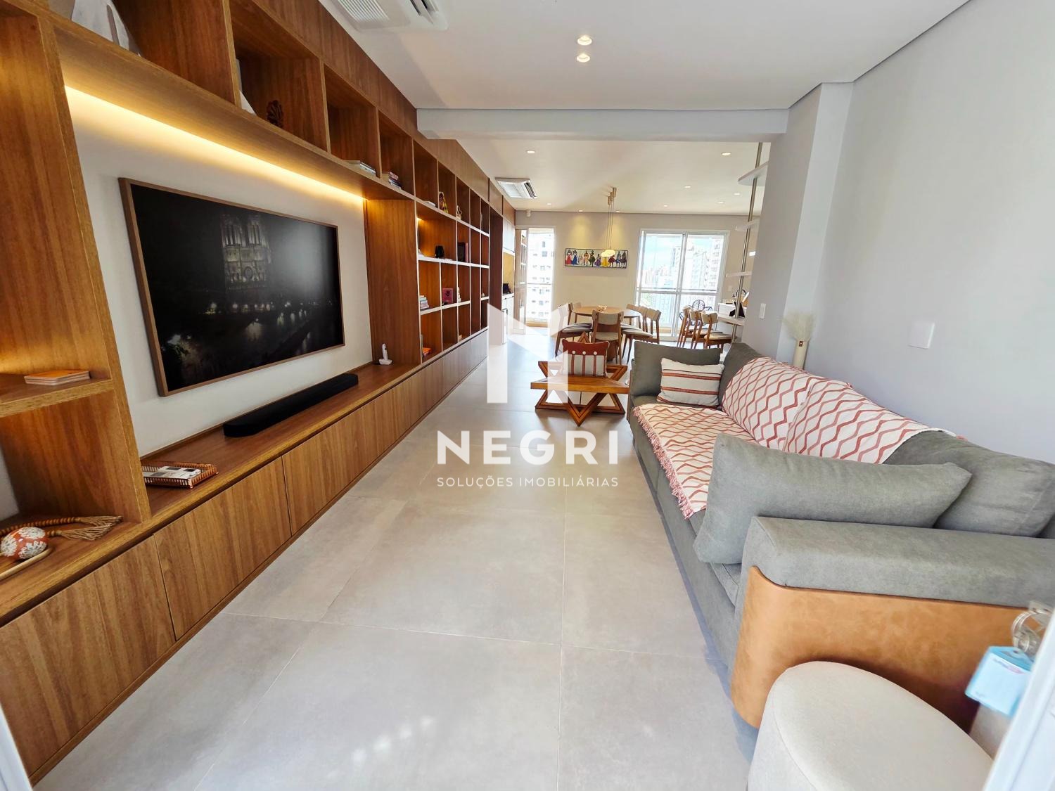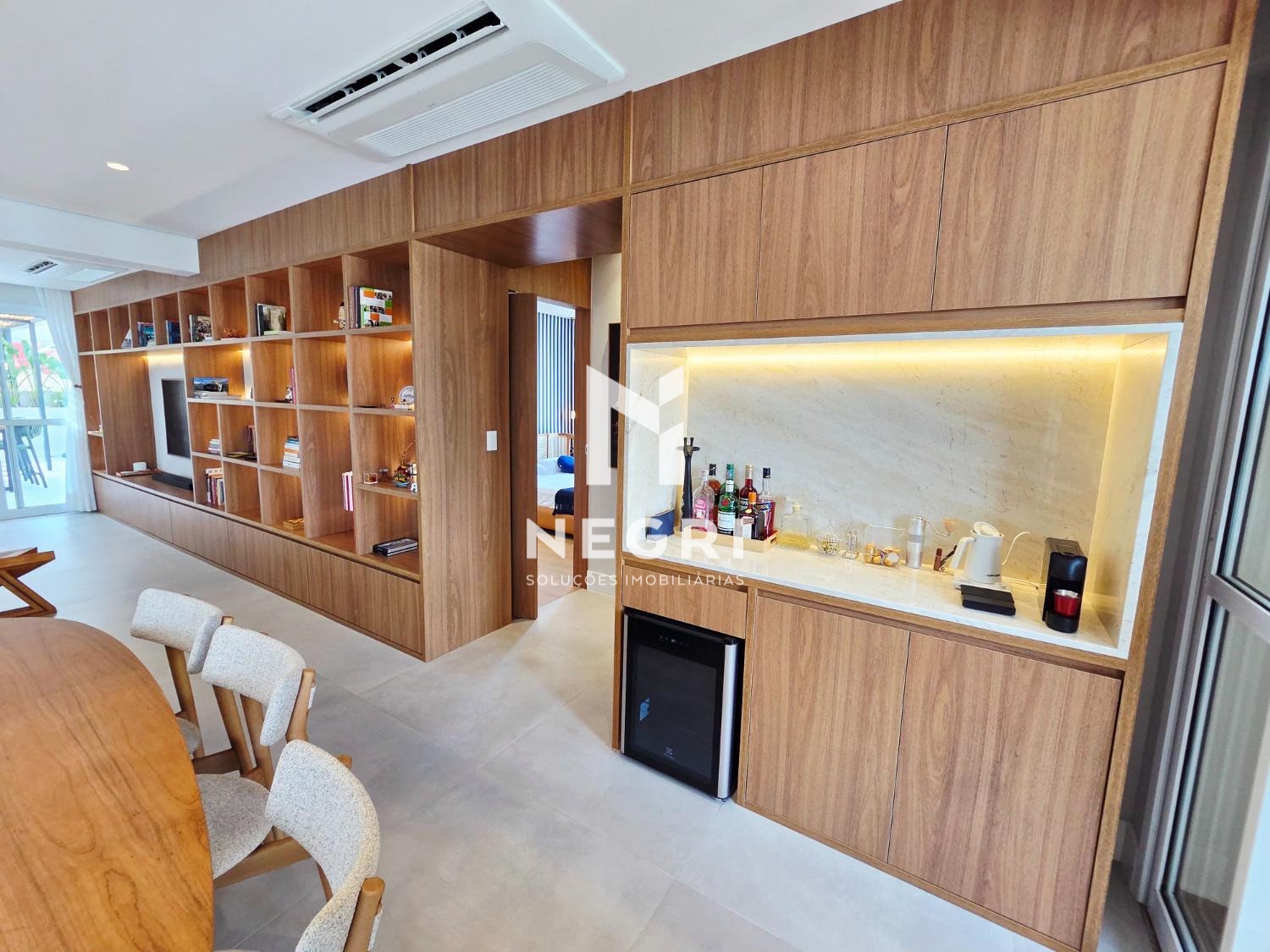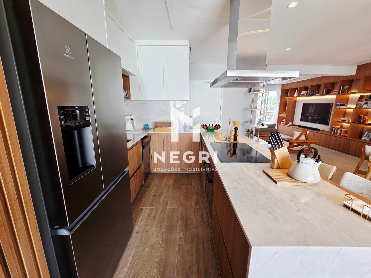 A sala de jantar se integra perfeitamente à cozinha gourmet e à sala de TV, criando um ambiente contínuo, elegante e extremamente convidativo — com mobiliário refinado e acabamentos de altíssimo padrão.
